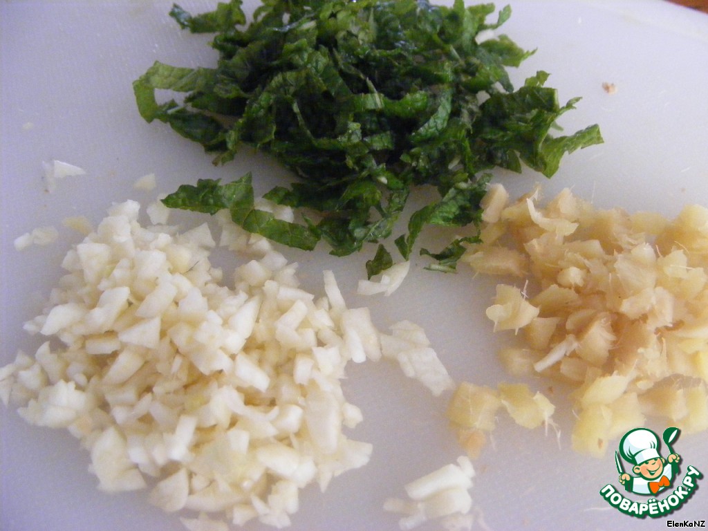 Помидоры, имбирь, чеснок и мяту режем мелко.