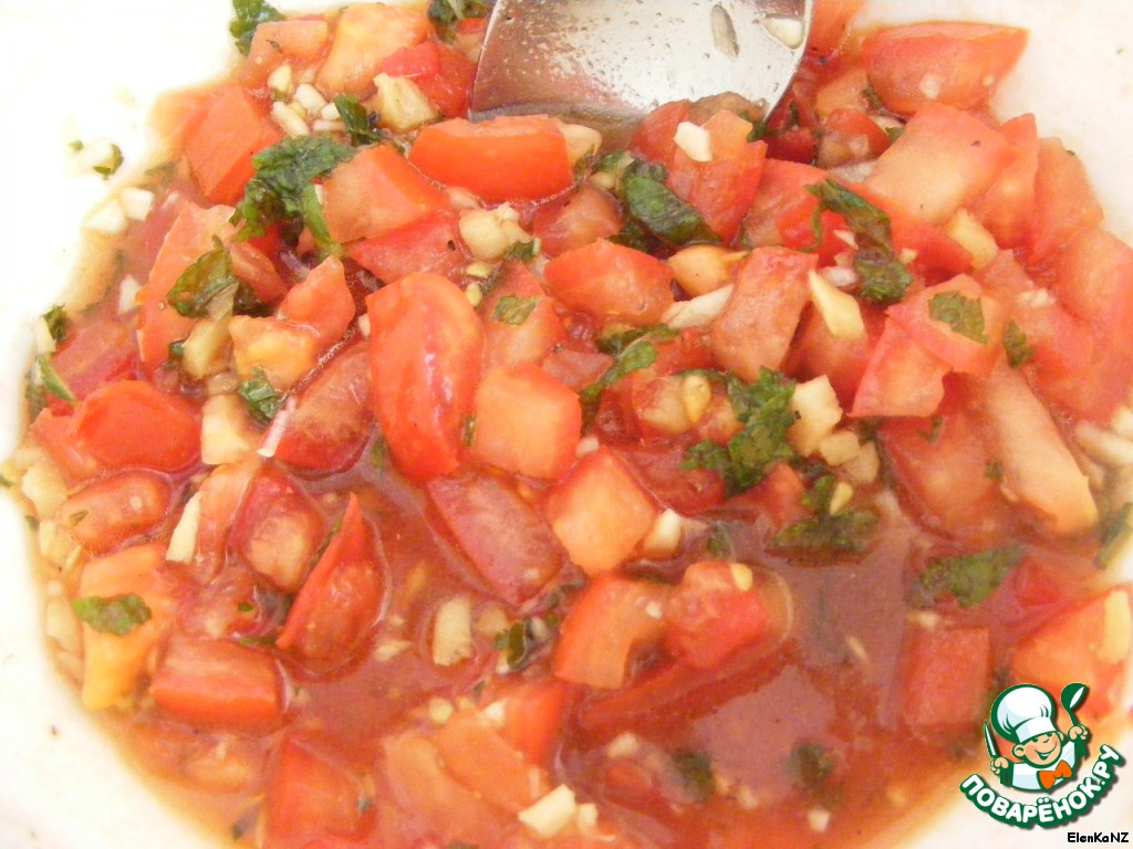 Кунжутное масло, лимонный сок, рыбный соус, сахар и перец смешиваем с помидорами и специями.