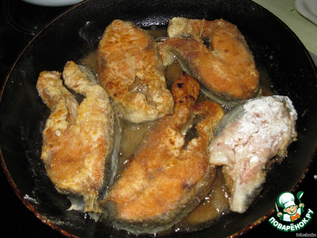 Рыбу разделать на стейки, посолить. Обвалять в муке и обжарить.
