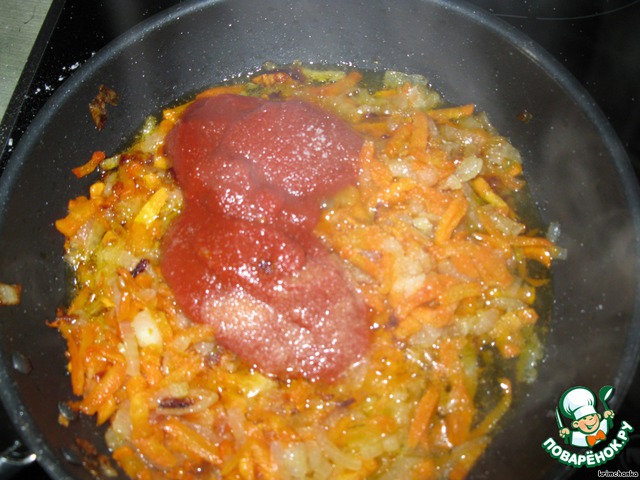 Готовим маринад: обжарить лук, морковь. Добавить томатную пасту, соль, сахар, перец молотый, щепотку карри. Протушить на слабом огне 5 минут.