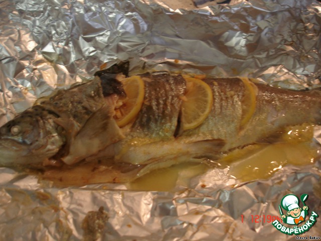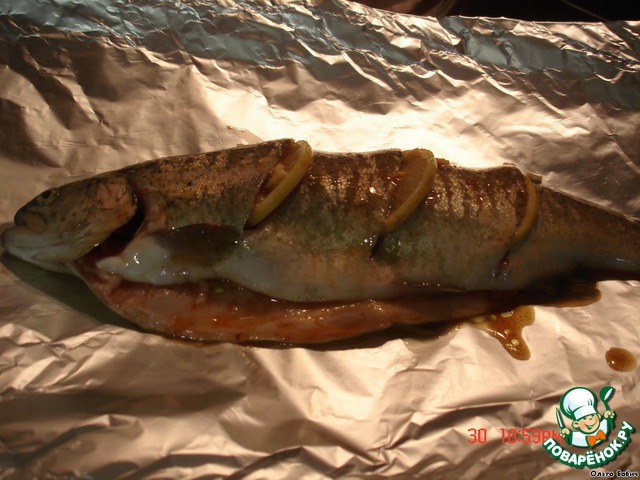 Заправить соусом форель и в разрезы с 2-х сторон вставить половинки ломтиков лимона, уложить на фольгу.