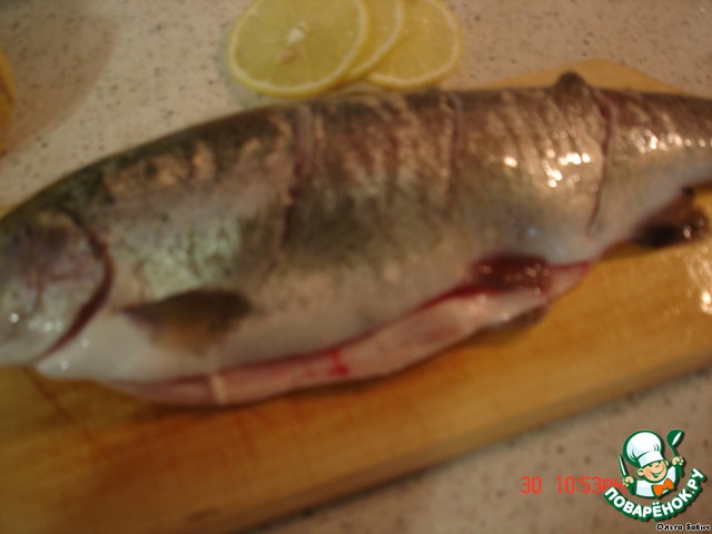 Приготовить рыбу (почистить, помыть), сделать 3 надреза.