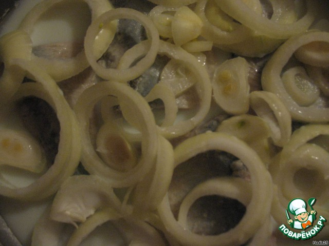 Лук нарезать кольцами, выложить на селедку.