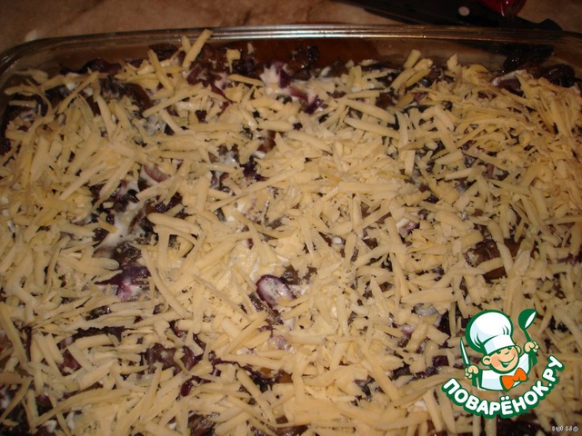 Пока мариновалась рыба, обжариваем на растительном масле грибы с луком (соль, специи - по вкусу).