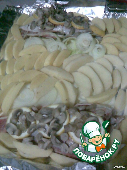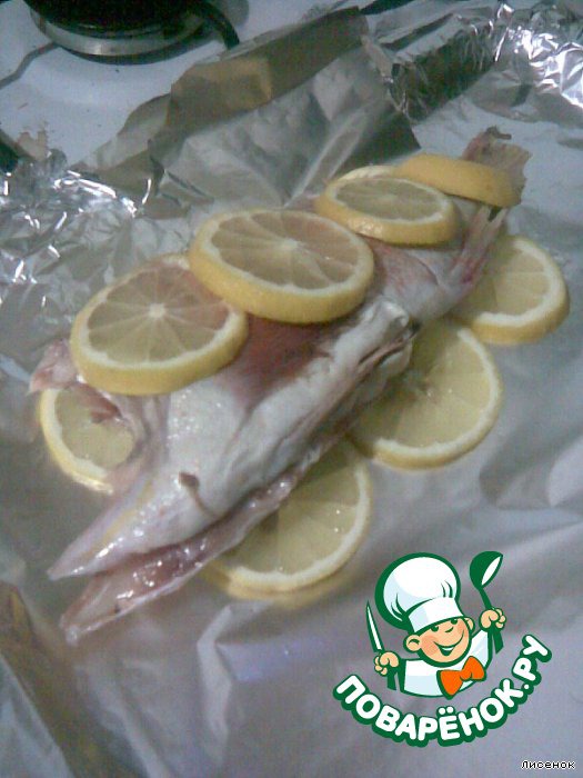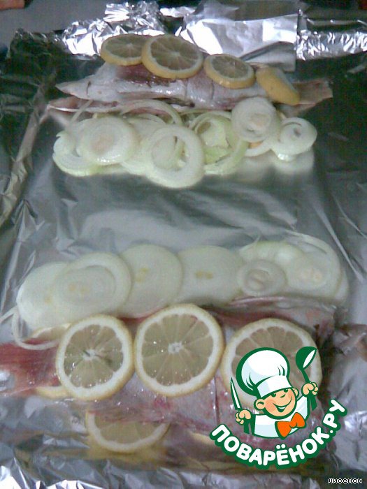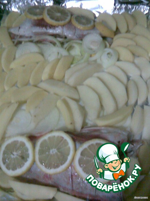 Сверху положить рыбу и на нее лимон.Пока рыбу отставим в сторону.