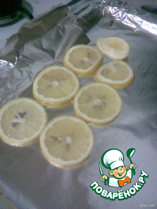 Противень выстелить фольгой,выложить лимон(по размеру рыбы)