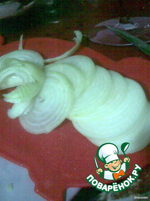 Отварные грибы режем пластинками и посыпаем сверху рыбку.