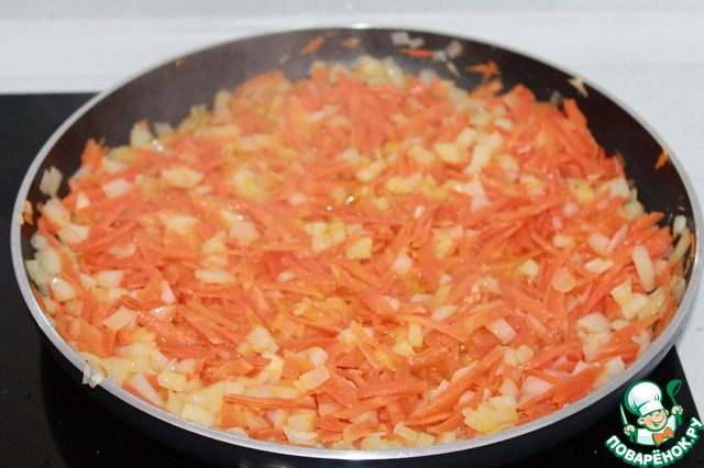 Лук и морковь. Накрываем крышкой и тушим все на очень медленном огне примерно 10 минут. Если хотите можете отправить все это в духовку. Я делала это на плите.