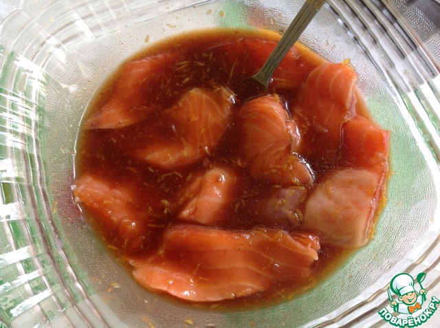 Смешать в посуде для маринования:мед, соевый соус, перец молотый красный жгучий, сладкий соус Чили, цедру и сок лимона