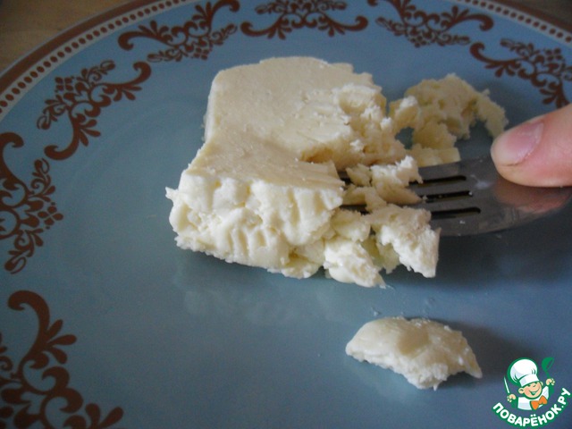 Уберите в холодильник тесто и займитесь начинкой наших треугольничков. Для этого нужно вилкой размять кусочек адыгейского сыра.