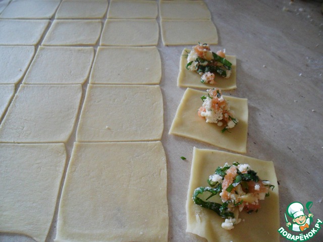 Режем пласт на квадратики 7-8 см и раскладываем начинку.