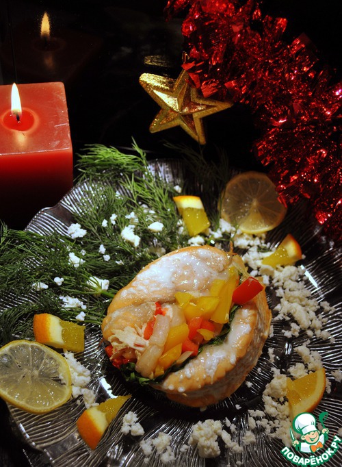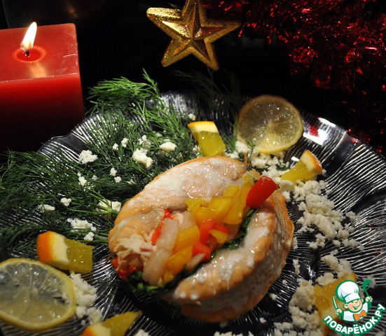 Кладем салат в середину рыбных стейков, я брала семгу. И сворачиваем рулетом. Размер рулета зависит от кусков рыбы, можно соединить два куска. Связываем ниткой, режем порционно, но так, чтобы нитка скрепляла каждый кусок порции, и ставим в печь, укрыв фольгой. На дно противня нальём немного лимонного сока и белого вина. Запекать минут 20-25 при температуре 180 градусов.
