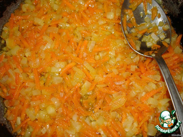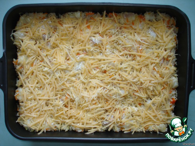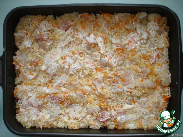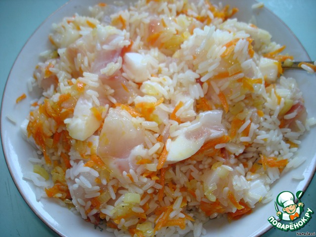 Все смешать - рыбку, рис, лук с морковкой, посолить, поперчить...
