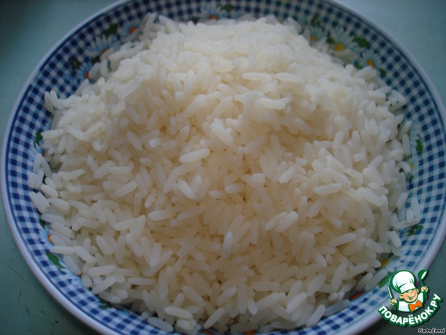 Отварить 1 стакан риса (я беру пропаренный, он никогда не разваривается, и остается целыми зернышками).