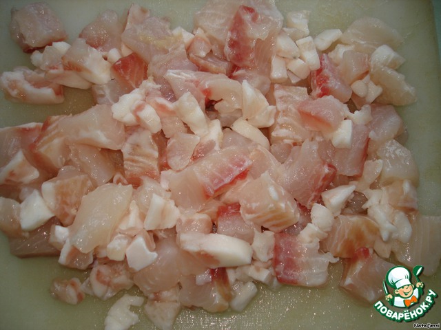 Морской язык нарезать не очень маленькими кусочками, жир я резала мелко.