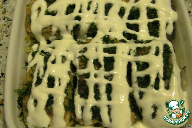 6.Рыбу выложить в форму, а сверху посыпать мелко нарезанным свежим или замороженным укропом.