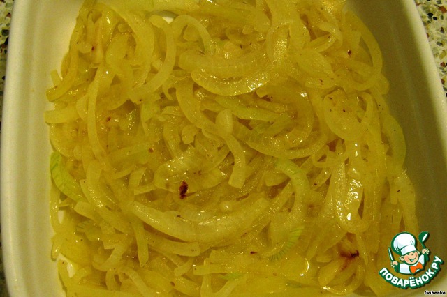 3.Спассеровать на постном масле нарезанный кольцами или полукольцами лук и выложить его в форму для запекания.