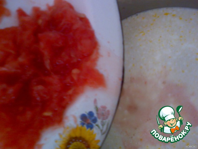 Трем помидоры на терке и добавляем в соус, солим, перчим, добавляем смесь трав