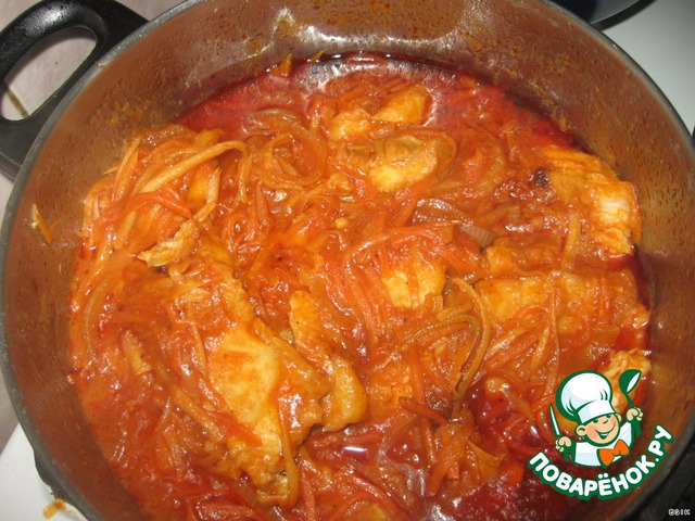 Первым слоем в кастрюльку выкладываем несколько ложек овощной зажарки, потом рыбу - и так слоями, пока все не закончится. последним слоем тоже должны быть овощи.