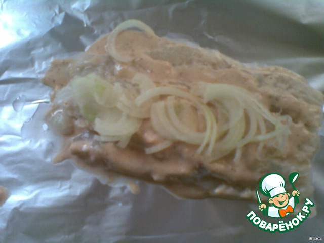 Рыбку помыла, вытерла полотенцем, смазала с двух сторон соусом и на фольгу. Сверху посыпать лучком, нарезанным полукольцами.