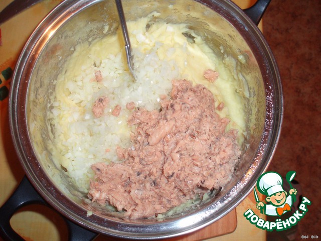 Отваренный картофель размять, смешать с яичными желтками, добавить порезанный лук и горбушу. Залить молоком и все хорошенько перемешать. Посолить, добавить специй по вкусу.