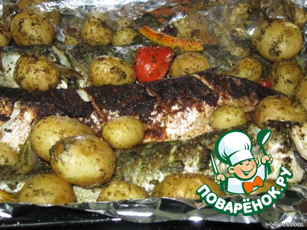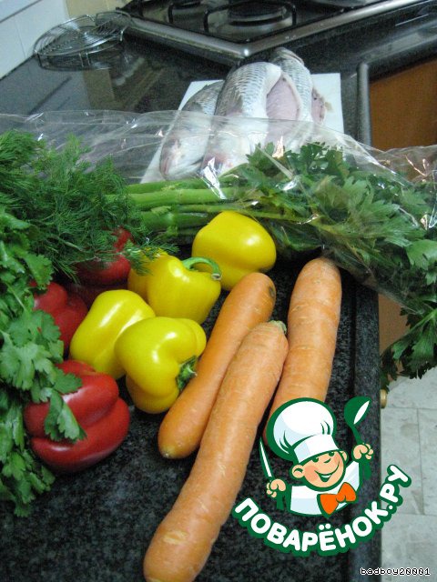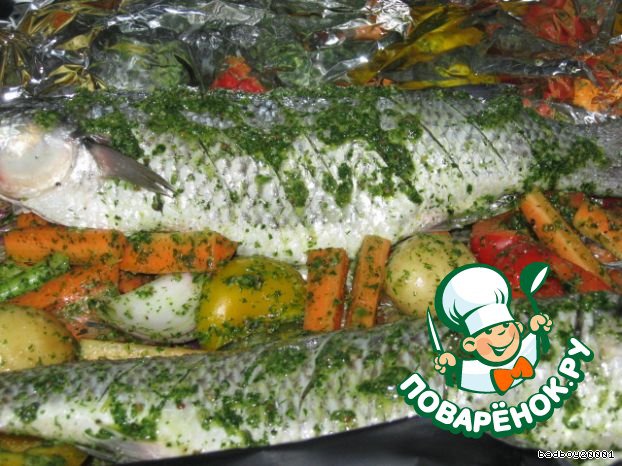 Тщательно вытереть рыбу бумажным полотенцем и натереть соусом, стараясь, чтобы соус попал в разрезы и середину рыбы. Овощи почистить и нарезать крупно.