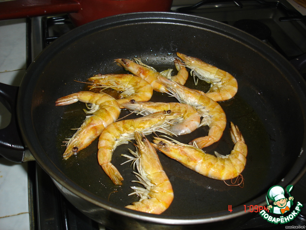В широкой плоской кастрюле слегка обжариваем на мaсле креветки, отставлаем