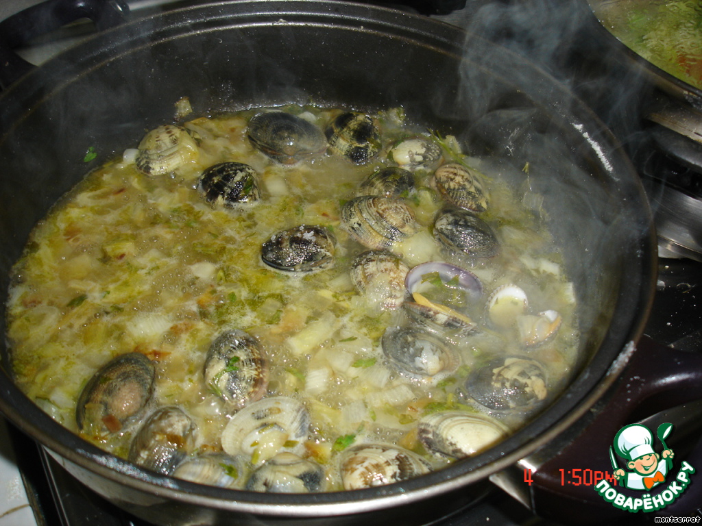 В готовый соус закладываем альмехас и нагреваем до момента раскрытия створок