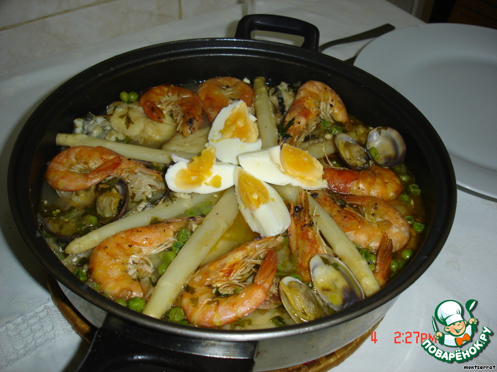 Сразу добавляем обжаренную рыбу, креветки, белую консервированную спаржу, кусочки вареного яйца, прогреваем до кипения,