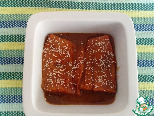 Выложить филе вместе с маринадом в форму для запекания, посыпать кунжутом. Запекать в заранее разогретой духовке (t=170 С) 15 минут, не более.