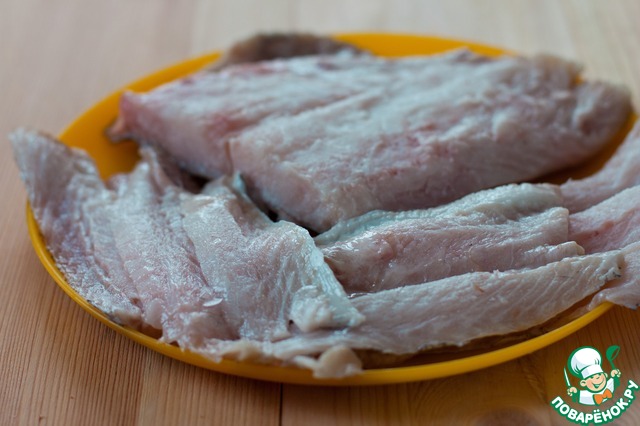Филе любой рыбы (семга, форель, горбуша, нерка, кета, судак... ) нарезать на тонкие длинные стейки.