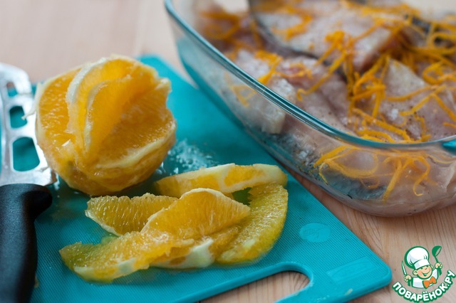 Сложить в глубокую емкость, каждый слой рыбы посолить, поперчить. Снять цедру с апельсина, посыпать ею рыбу. Очистить от кожуры 2 апельсина, вырезать филе. Делайте это над пластиковой доской или тарелкой, чтобы собрать апельсиновый сок. Остатки филетированных апельсинов отжать, добавить 2 ст. л. лимонного сока, посолить, поперчить и полить этим маринадом рыбу. Накрыть емкость пленкой или крышкой, убрать в холод для маринования минимум на 30 минут.