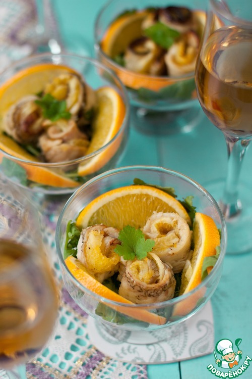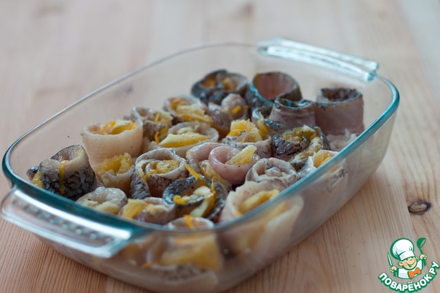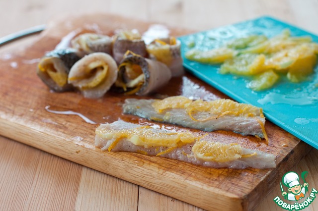 На каждую рыбную полоску кладем дольки апельсинов по всей длине и сворачиваем рулетом.