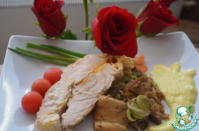 От себя: советую приготовить соуса меньше, как минимум в два раза. Он получается слишком жирным и для такого количества рыбки его слишком много. Также - грибы очень жирные. Советую приготовить грибов только половину порции, остальную часть гарнира подать в виде вареных овощей - они как-то сбалансируют жирный вкус соуса и грибов.