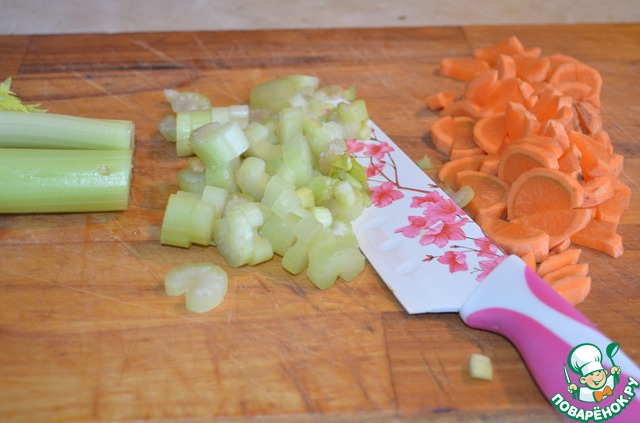 Сельдерей и морковь нарезаем крупными брусочками. Складываем в широкую кастрюлю.