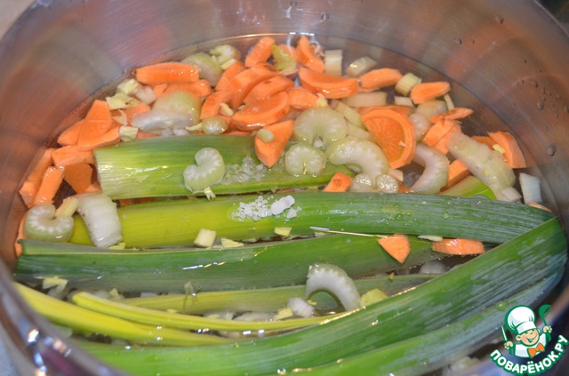 Зеленую часть лука-порея хорошо промыть (в листочках скапливается очень много песка) и положить в кастрюлю к овощам. Засыпать белый перец горошком и 2 ст. л. крупной морской соли. Довести до кипения и проварить 2 минуты.