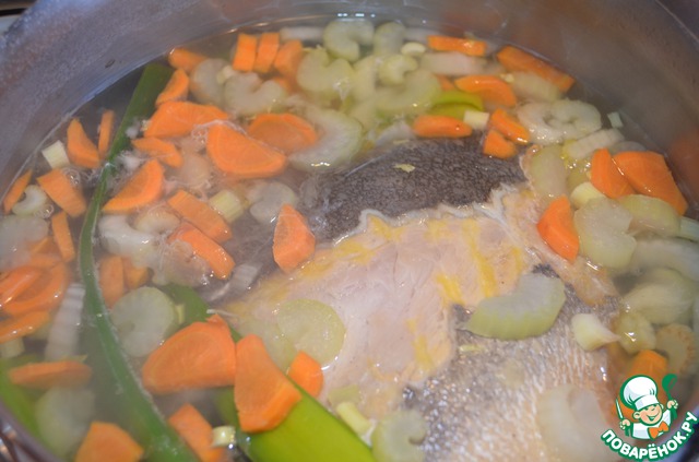 Рыбку вынуть из бульона, остудить, снять шкурку. Нарезать порционными кусочками.