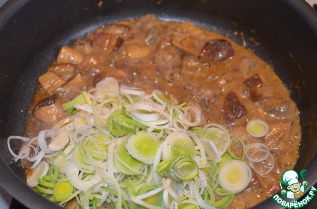 Белую часть лука-порея тонко нарежьте колечками и добавьте к грибам. Поперчить белым перцем, посолить, обжарить еще минуты две.
