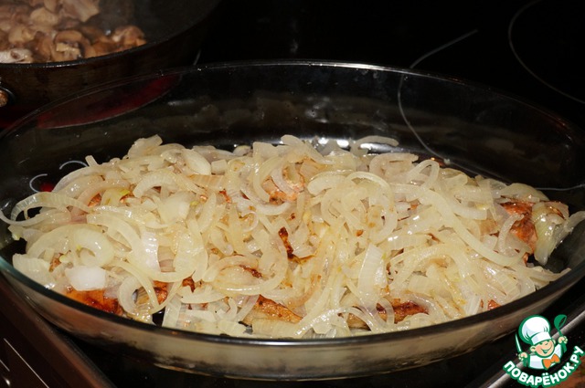 Лук режем полукольцами (или четвертинками, если луковица большая) и пассеруем на оливковом масле до золотистого цвета, немного посолив в процессе.