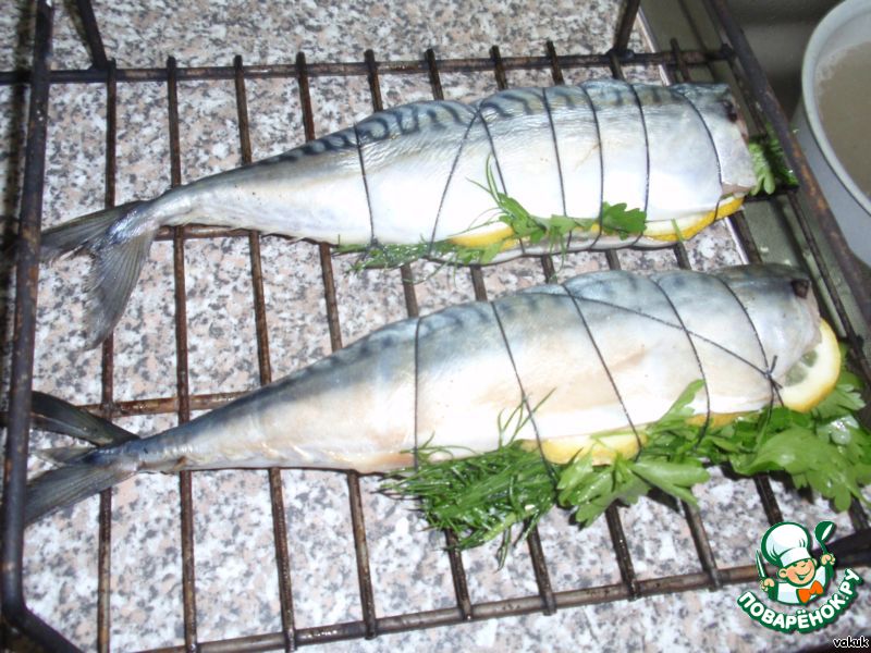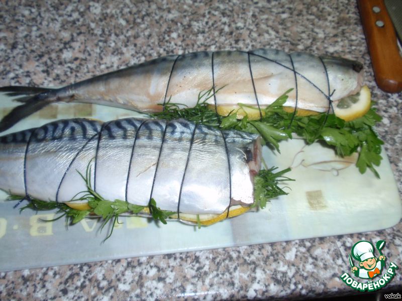 Надрезать спинку и поместить туда 3-4 кусочка лимона. В брюхо -лимон, свежий укроп и петрушку.