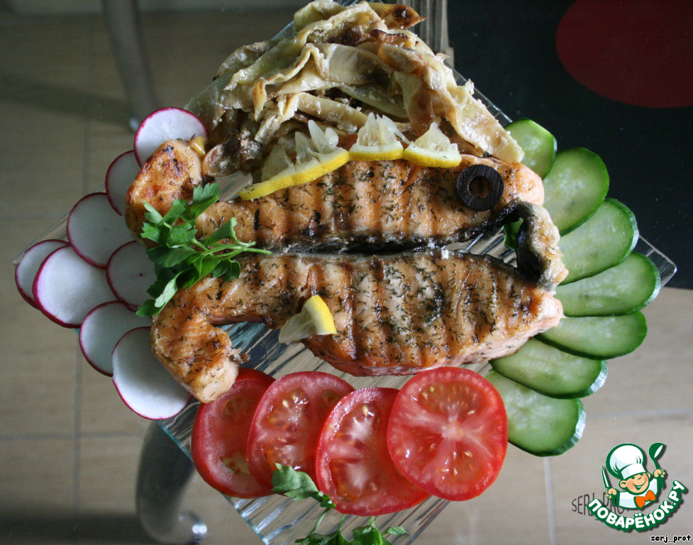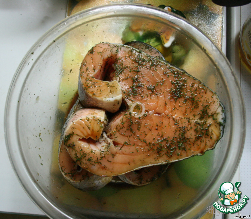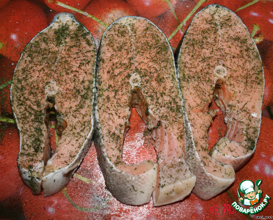 Стейки натереть укропом и смочить соевым соусом, загрузить в холодильник на 30 мин.