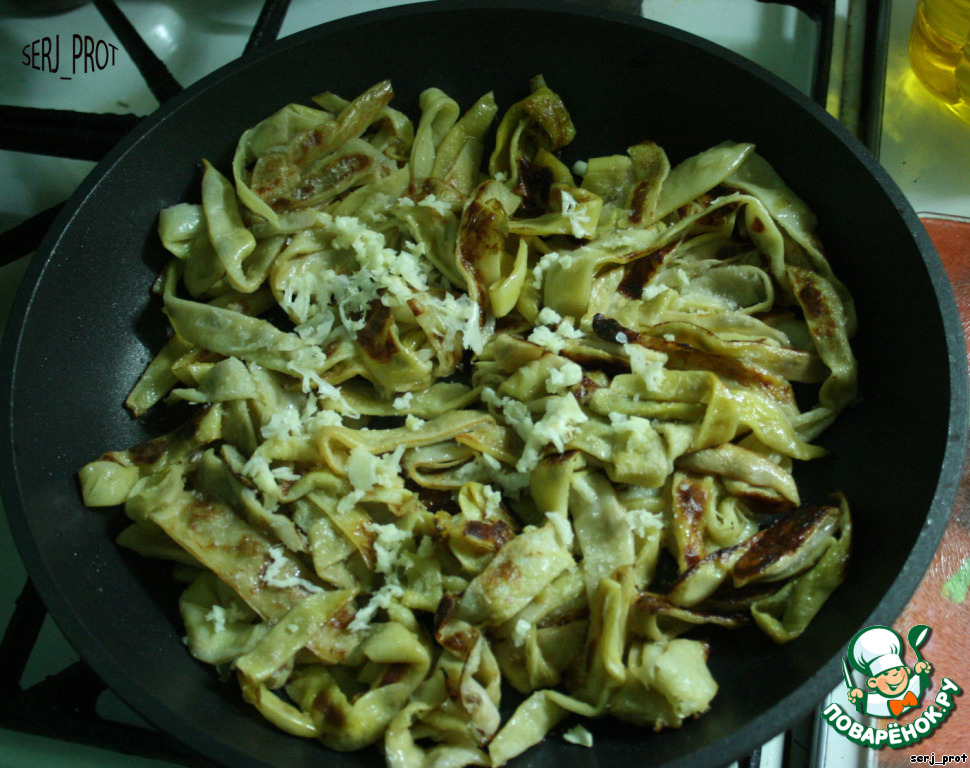 Обжарить на масле, за 5 мин. до готовности добавить чеснок 3 зубка и сметану.
