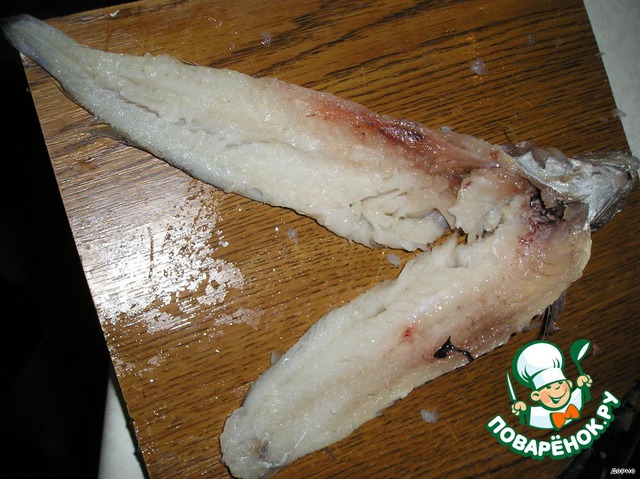 Приступим к рыбе! Отрезаем ножницами плавники. Разрезаем по хребту с двух сторон и отрезаем хребет. Получается голова и две филейки.