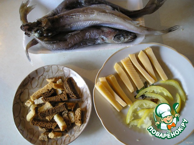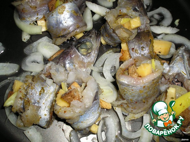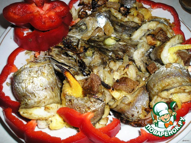 | Тощая смешная морская рыба путассу с большущими глазами очаровательно глядит с блюда, поигрывая апетитными рулетиками на спине... |