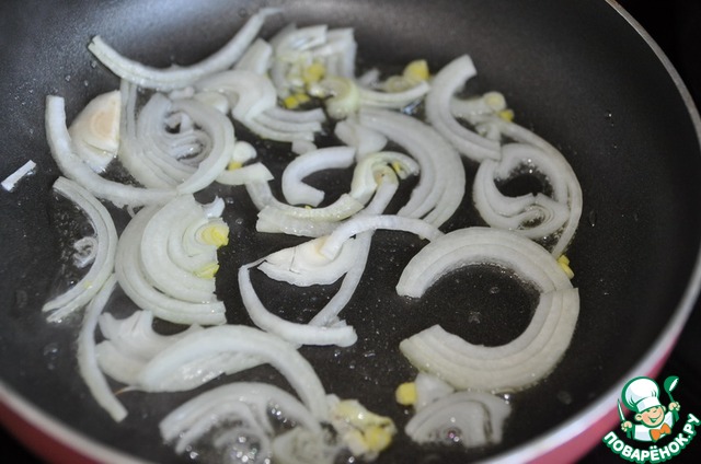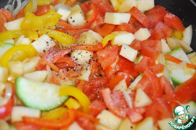 Добавляем цуккини, перец, чеснок и жарим-тушим 5 минут.