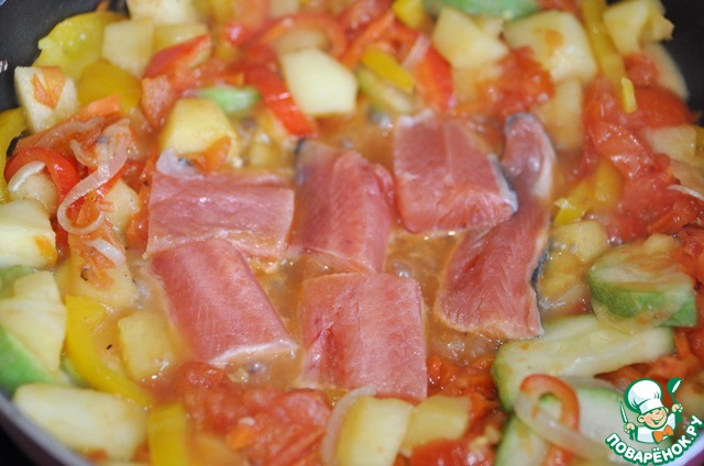 Раздвигаем овощи на сковороде и посередине кладём кусочки рыбы. Тушим ещё 5 минут при закрытой крышке.