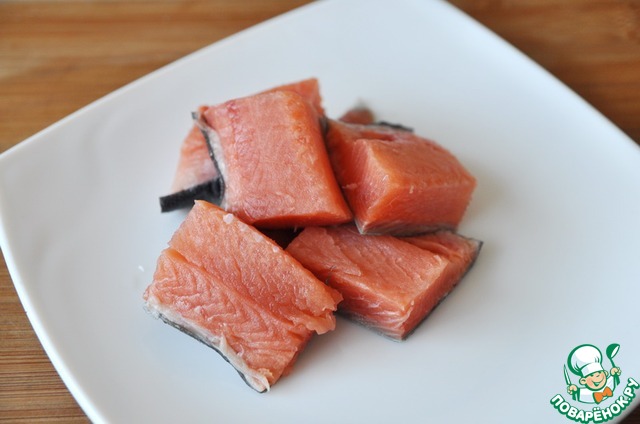 Рыбу чистим, разделываем на филе, режем на кусочки (у меня 2 на 3 см).