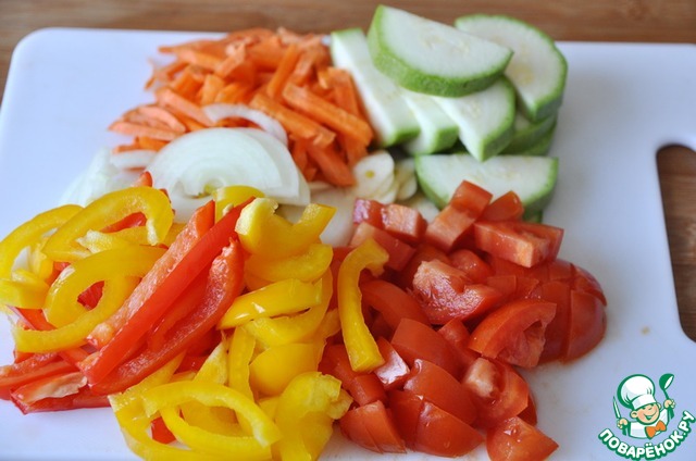 Лук и цуккини - полукольцами, перец болгарский и морковь - тонкими полосками, чеснок - пластинами, помидоры - кубиками.