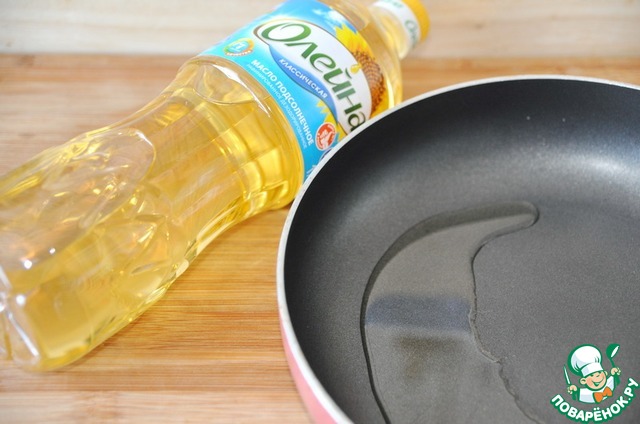 Берём подсолнечное масло "Олейна", наливаем на сковороду.
