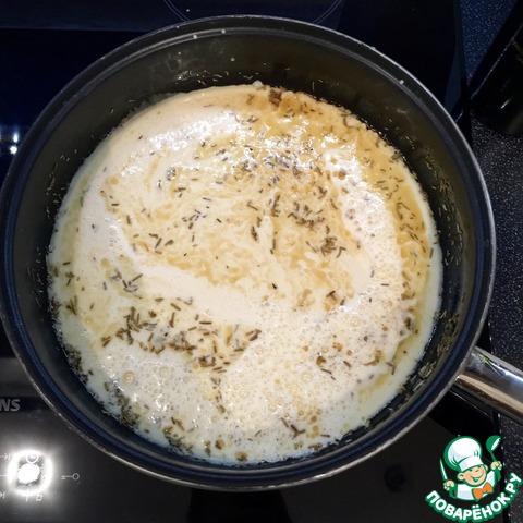 Выливаем туда нашу молочно-яичную смесь. На среднем огне держим 1 минуту, НЕ МЕШАЕМ. Ставим в духовку, разогретую до 200 градусов Цельсия на 12 минут.